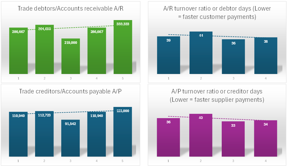 Balance sheet graphs and ratios to help you assess the business's financial history.